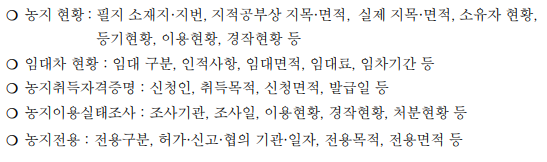 - 작성내용 : 지목, 면적, 용도지역 구분 등 농지 일반현황 및 소유사항, 경작현황, 임대차사항, 농지취득자격증명, 농지이용실태조사 관련 사항 등이 기록