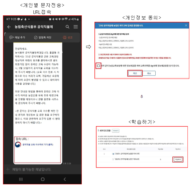 ☞ 모바일 교육 이수방법 : 전송받은 문자 통한 URL 접속 → 개인정보 동의 → 학습하기 버튼