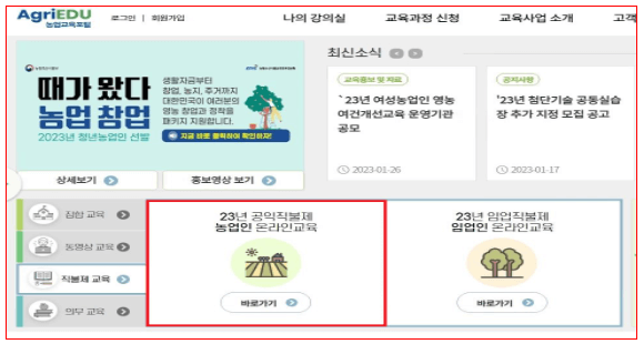 ① 배너 바로가기를 통해 사이트 접속 시 메인화면에서 직불금 온라인 교육 클릭
