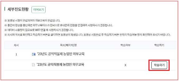 ⑥ 시청완료 후 학습여부 항목 O/X를 확인하거나 해당 관할지 읍면동사무소 전화하여 학습여부 확인 요청