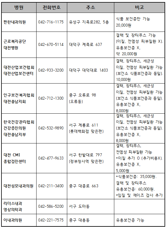 대전 보건증 발급 가능 병원 알아보겠습니다. 비용 등 변동사항 있을 수 있으니 미리 유선 문의 후 방문하시기 바랍니다.