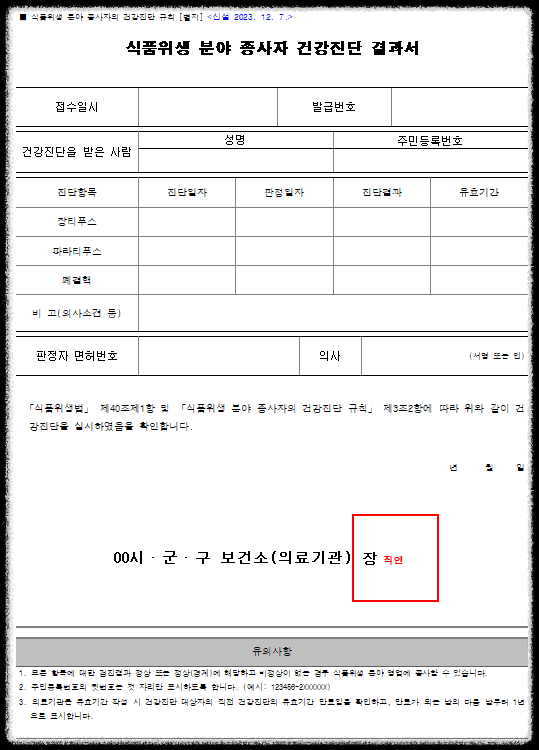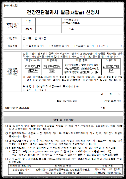 보건증 식품위생 업종 종사하려면 필수 서류로 요즘은 건강진단결과서라는 명칭으로 불립니다. 보건증 양식, 신청서식, 대리 수령위임장 서식 공유드립니다. 보건증 발급되는데 시간 걸리니 바로 신청하시기 바랍니다.