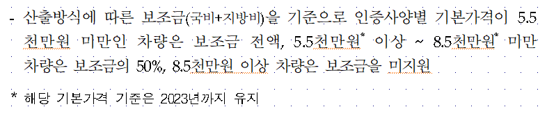 기본 가격이 5,500만 원 미만인 차량은 보조금 전액, 5,500만 원 이상 8,500만 원 미만인 차량은 보조금의 50%, 8,500만 원 이상인 차량은 보조금이 미지급된다. 그리고 보조금은 상한 한도 내에서 자동차의 성능(연비, 주행거리) 등에 따라 차등 지급되며, 차종별로는 기아자동차 EV6와 현대자동차 아이오닉 5 2WD가 승용차 중 보조금 지원금액이 가장 높다.